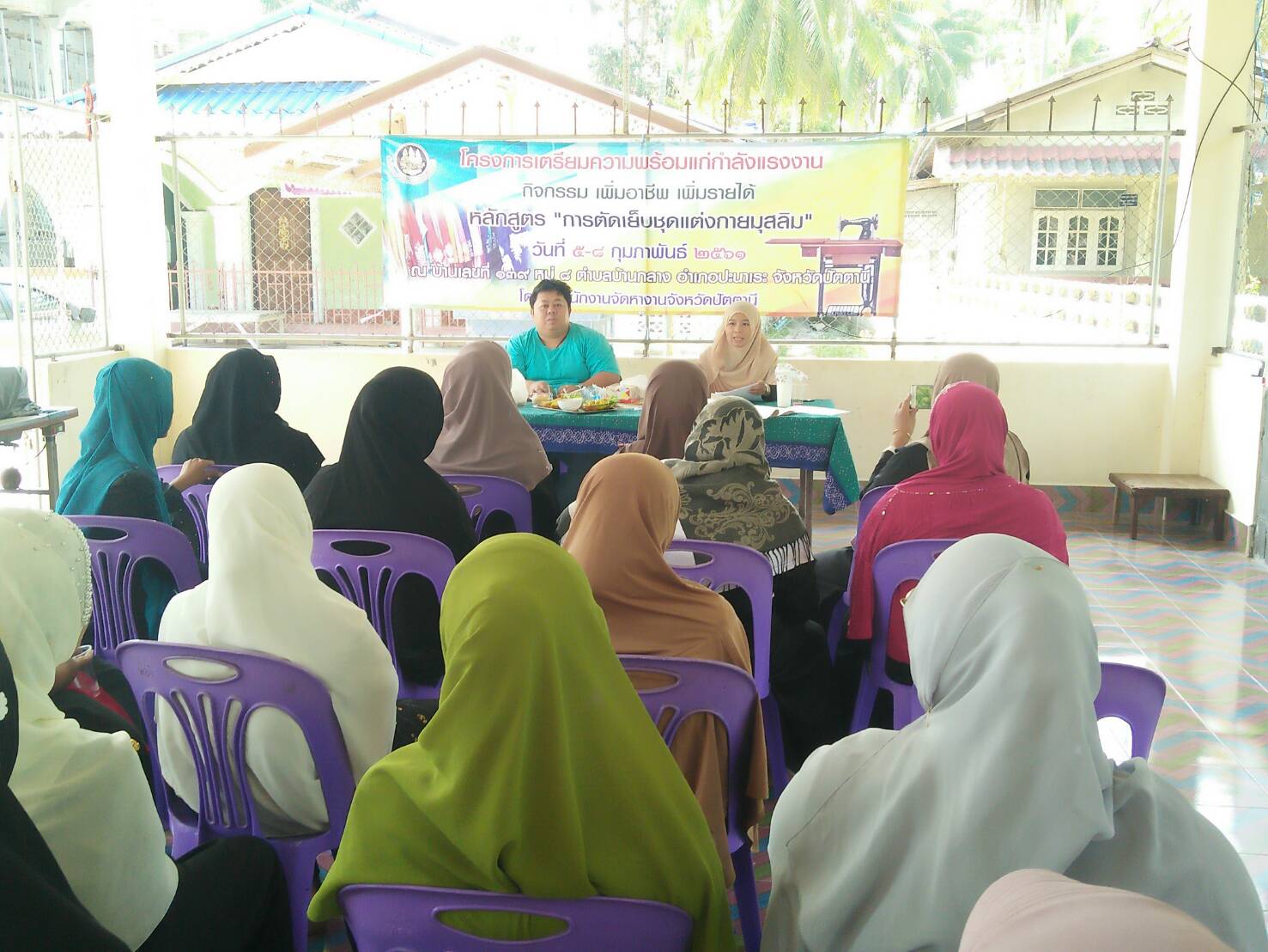 วันที่ ๘ กุมภาพันธ์ ๒๕๖๑ สำนักงานพัฒนาชุมชนจังหวัดปัตตานี โดย นายไพรัช ณ ถลาง นักวิชาการพัฒนาชุมชนชำนาญการ พร้อมด้วย น.ส.รอสนะ นาแซ พัฒนากรผู้ประสานงานตำบลบ้านกลาง สนง.พัฒนาชุมชนอำเภอปะนาเระ ร่วมเป็นวิทยากรบรรยายภายใต้โครงการเตรียมความพร้อมแก่กำลังแรงงาน กิจกรรมเพิ่มอาชีพ เพิ่มรายได้ หลักสูตร “การตัดเย็บชุดแต่งกายมุสลิม” ซึ่งจัดโดย สนง.จัดหางานจังหวัดปัตตานี โดยได้ให้คำแนะนำด้านการบริหารจัดการกลุ่ม การลงทะเบียนผู้ผลิตผู้ประกอบการ OTOP และการสมัครสมาชิก/การขอรับการสนับสนุนงบประมาณจากกองทุนพัฒนาสตรีในการต่อยอดอาชีพ ณ บ้านแหลมแป้ง ม.๘ ต.บ้านกลาง อ.ปะนาเระ จ.ปัตตานี มีสมาชิกกลุ่มตัดเย็บเสื้อผ้าเข้าร่วมกิจกรรม จำนวน ๒๐ คน ผลการดำเนินงานเป็นไปด้วยความเรียบร้อย