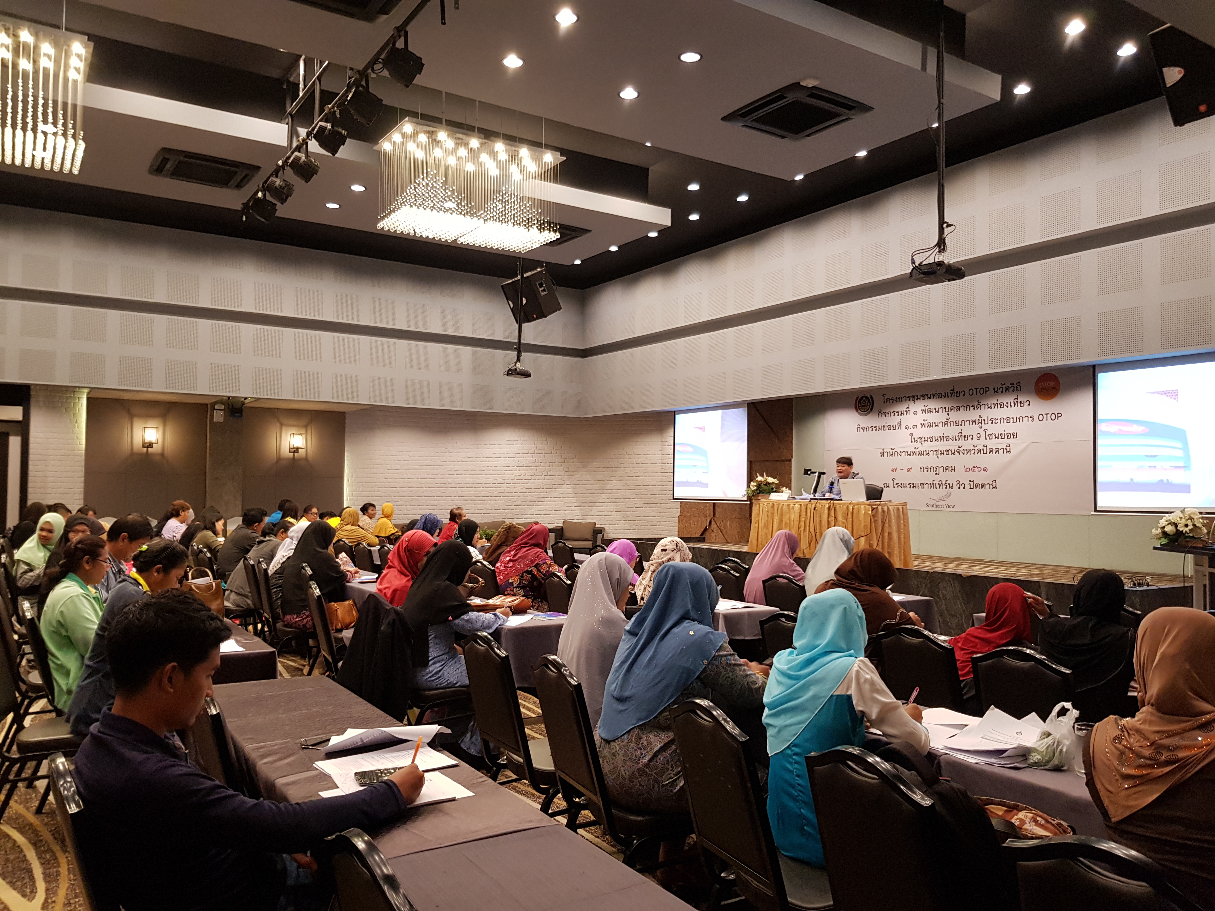 วันที่ 8 กรกฎาคม 2561 – นายสุริยะ กิตติบุญญา พัฒนาการจังหวัดปัตตานี มอบหมายให้นายอับดุลรอฮิม เซะบารู หัวหน้ากลุ่มงานสารสนเทศฯ พร้อมด้วย หัวหน้าฝ่ายฯ และนักวิชาการพัฒนาชุมชนจังหวัด จัดอบรมโครงการพัฒนาศักยภาพผู้ประกอบการ OTOP นวัตวิถี ชุมชนท่องเที่ยว ในจังหวัดปัตตานี โดยมีดร.ปรีดี โชติช่วง ผู้ทรงคุณวุฒิ สถาบันราชภัฎฯ เป็นวิทยากรบรรยาย ให้ผู้เข้าอบรม จำนวน 90 คน เพื่อสร้างและพัฒนาศักยภาพผู้ประกอบการ OTOP ในชุมชนท่องเที่ยวให้มีขีดความสามารถในการพัฒนาผลิตภัณฑ์ OTOP ณ ห้องประชุมพญาตานี 2 โรงแรม เซาท์เทิร์น วิวว์ ปัตตานี