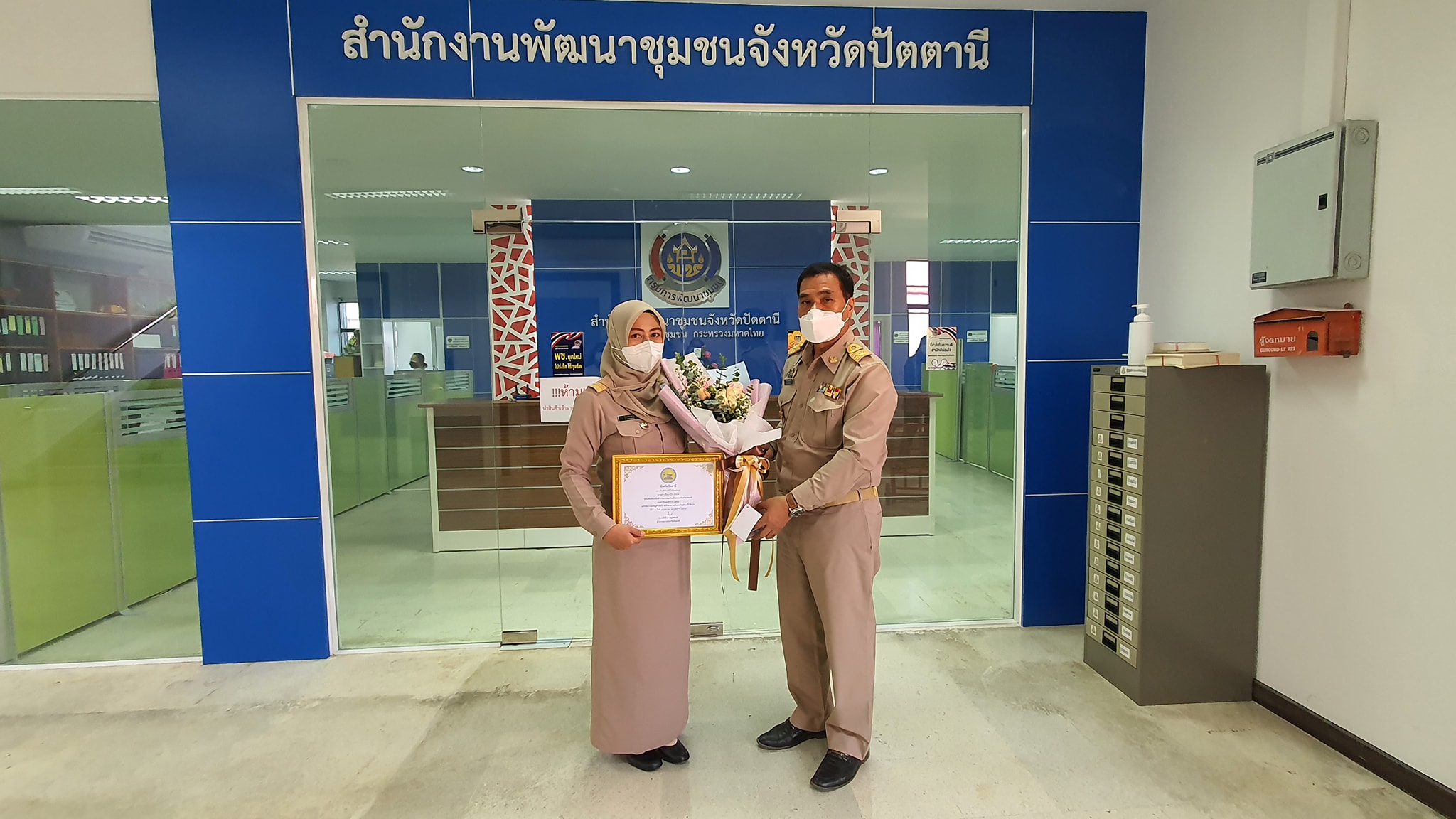 นายธีรวิทย์ กู้เกียรติ พัฒนาการจังหวัดปัตตานี และเจ้าหน้าพัฒนาชุมชน มอบช่อดอกไม้แสดงความยินดี กับ นางสาวสือนานิง เจ๊ะโด ตำแหน่งเจ้าพนักงานธุรการชำนาญงาน สังกัดกลุ่มงานประสานและสนับสนุนการบริหารงานพัฒนาชุมชน สำนักงานพัฒนาชุมชนจังหวัดปัตตานี ในโอกาสได้รับคัดเลือกฯ “ข้าราชการพลเรือนดีเด่นระดับจังหวัด” ประจำปี 2564