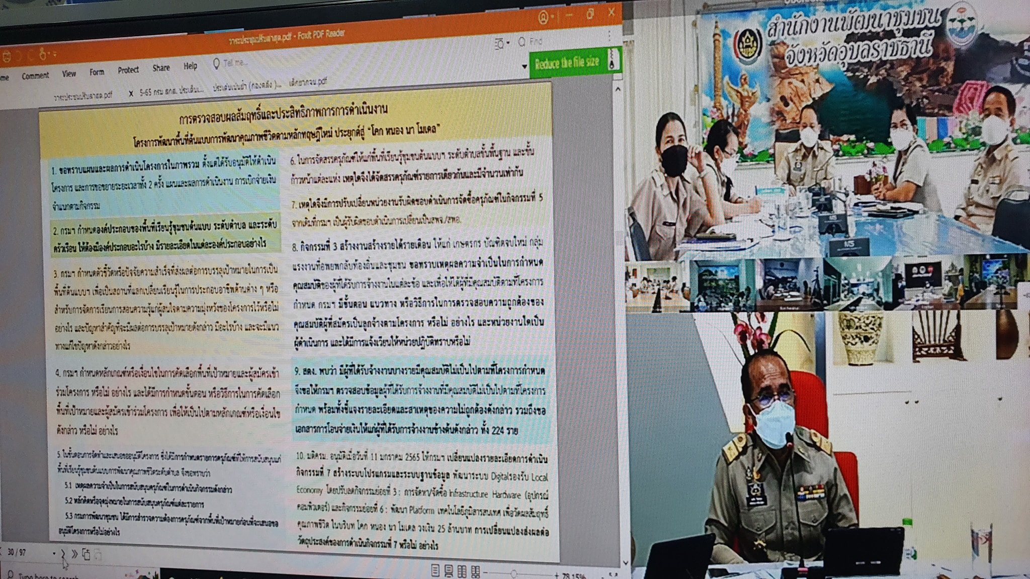 โดยมี นายสมคิด จันทมฤก อธิบดีกรมการพัฒนาชุมชน เป็นประธานการประชุมฯ เพื่อติดตามความก้าวหน้าของภารกิจสำคัญและสรุปผลการดำเนินงานพัฒนาชุมชนและรับทราบนโยบายเร่งด่วนของรัฐบาลให้สามารถดำเนินการให้เป็นไปในทิศทางเดียวกัน ตลอดจนหารือข้อราชการงานสำคัญต่าง ๆ ผ่านระบบการประชุมทางไกล (Video Conference) พร้อมกัน 76 จังหวัดทั่วประเทศ และถ่ายทอดสัญญาณสดผ่าน YouTube Channel ทีวี TV. เพื่อให้สำนักงานพัฒนาชุมชนอำเภอ ทุกอำเภอ ร่วมประชุมและรับฟังการประชุมฯ จากห้องประชุม War Room ชั้น 5 กรมการพัฒนาชุมชน ศูนย์ราชการเฉลิมพระเกียรติ ๘๐ พรรษา ถนนแจ้งวัฒนะ หลักสี่ กทม. โดยพร้อมกัน ซึ่ง มีรองอธิบดีกรมการพัฒนาชุมชน ผู้ตรวจราชการกรมการพัฒนาชุมชน ผู้อำนวยการสำนัก/กอง ตลอดจนเจ้าหน้าที่ผู้เกี่ยวข้อง เข้าร่วมประชุมนำเสนอและรายงานผลการดำเนินงานในวาระประเด็นสำคัญ ดังนี้