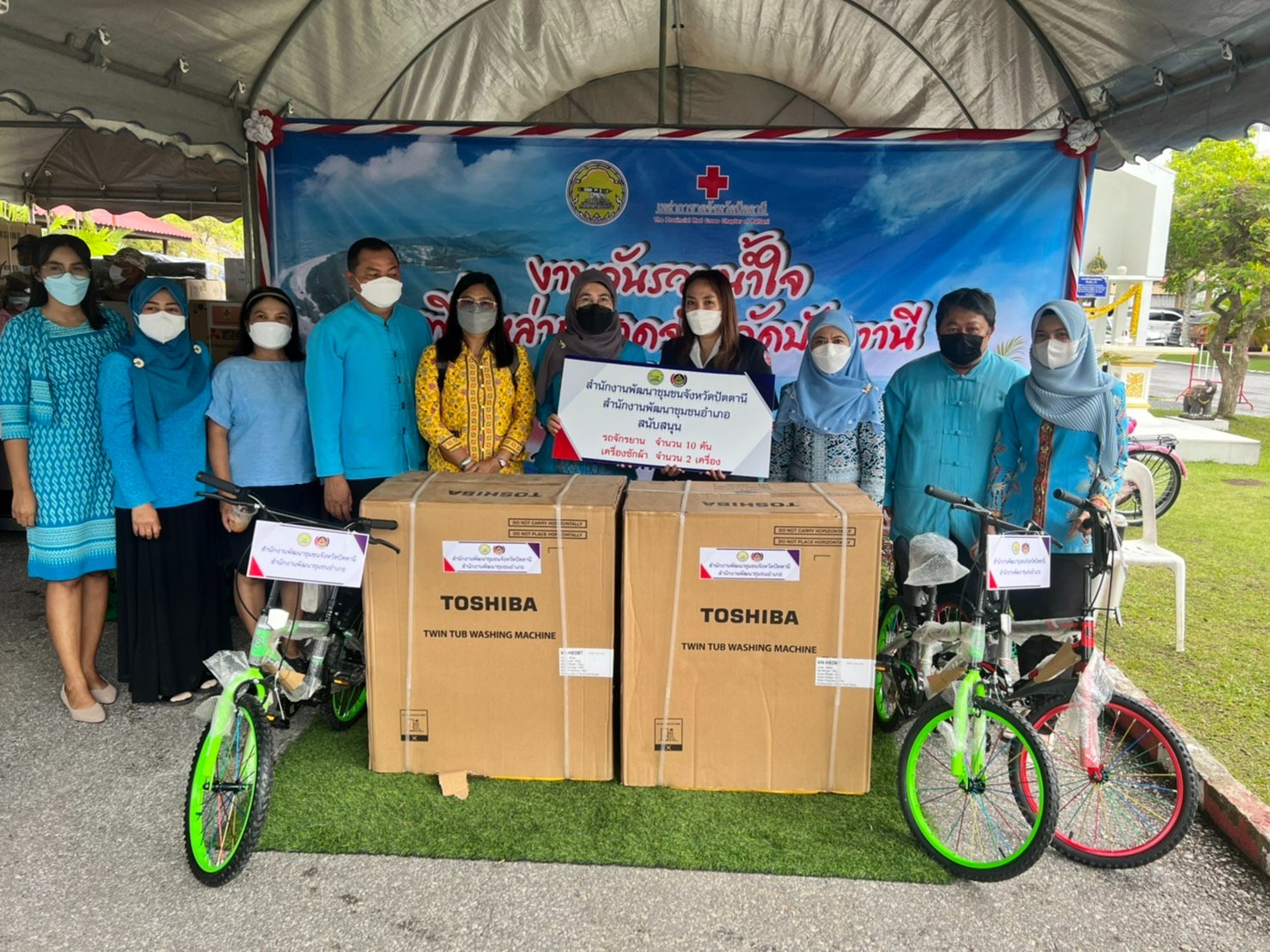 วันที่ 4 สิงหาคม 2565 – นายธีรวิทย์ กู้เกียรติ พัฒนาการจังหวัดปัตตานี มอบหมายให้ นางสาวฟารีดา ม่าเหร็ม ผอ.กลุ่มงานส่งเสริมการพัฒนาชุมชน นำข้าราชการและเจ้าหน้าที่สังกัด สนง.พัฒนาชุมชนจังหวัดปัตตานี ร่วมงานแถลงข่าวการจัดงานแสดงสินค้า ศิลปวัฒนธรรมและงานประจำปีจังหวัดปัตตานี วิถีใหม่ ในมหกรรม “รวมน้ำใจ เพื่อเหล่ากาชาด จังหวัดปัตตานี ประจำปี 2565” พร้อมมอบรถจักรยาน จำนวน 10 คัน และ เครื่องซักผ้า จำนวน 2 เครื่อง เพื่อใช้เป็นของสมนาคุณและของรางวัลในงานกาชาดปัตตานี โดยมี นายนิพันธ์ บุญหลวง ผู้ว่าราชการจังหวัดปัตตานี และ นางประภา บุญหลวง ประธานแม่บ้านมหาดไทยและนายกเหล่ากาชาดจังหวัดปัตตานี เป็นผู้รับมอบ ณ จวนผู้ว่าราชการจังหวัดปัตตานี