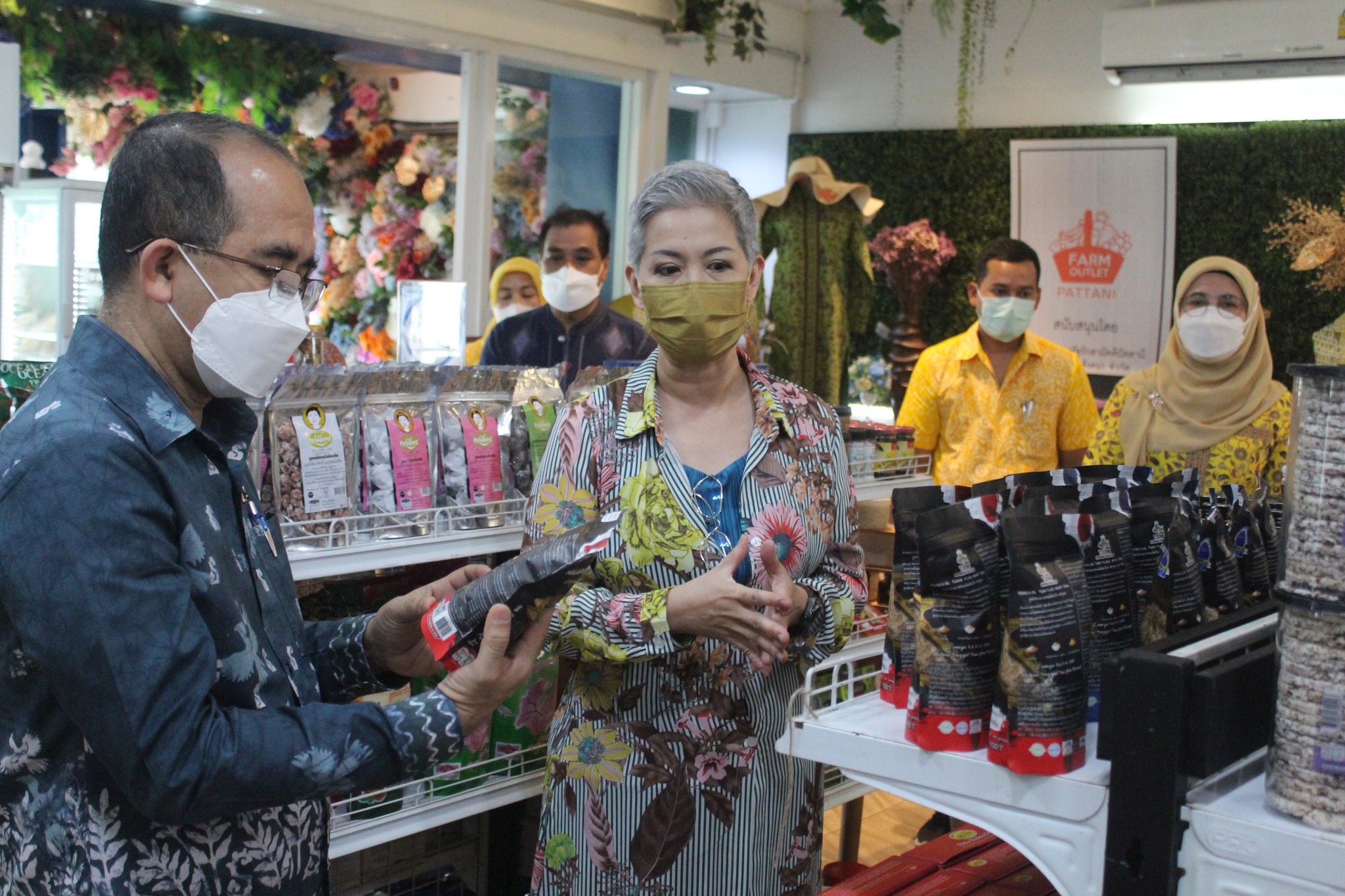 12 กันยายน 2565 – นายธีรวิทย์ กู้เกียรติ พัฒนาการจังหวัดปัตตานี พร้อมด้วย ดร.ตติยะ ฉิมพาลี ประธานบริษัทประชารัฐรักสามัคคีปัตตานีฯ และคุณสุพิชฌาย์ ลิ่มกังวาฬมงคล ผู้จัดการร้านฟาร์มเอาท์เลตปัตตานี และที่ปรึกษาฯ ภายใต้การดำเนินงานของบริษัทประชารัฐฯปัตตานี / เครือข่ายหนึ่งตำบลหนึ่งผลิตภัณฑ์และกลุ่มผู้ผลิตและผู้ประกอบการ / ผู้อำนวยการกลุ่มงาน/นักวิชาการพัฒนาชุมชนและนักส่งเสริมการตลาด ร่วมต้อนรับ นายสมคิด จันทมฤก อธิบดีกรมการพัฒนาชุมชน พร้อมด้วย ผศ.ดร.ศศิธร จันทมฤก ประธานชมรมแม่บ้านพัฒนาชุมชน ในโอกาสเดินทางมาปฏิบัติราชการในพื้นที่ปัตตานีและเยี่ยมชมร้านฟาร์มเอาท์เล็ทปัตตานี พร้อมคณะฯ นายกิจจา ทองแดง ผู้ตรวจราชการกรมการพัฒนาชุมชน เขตตรวจราชการ ที่7 เขตภาคใต้ชายแดน(ปัตตานี ยะลา นราธิวาส) ณ ฟาร์มเอาท์เลท ปัตตานี (Farm Outlet Pattani) บริเวณบ้านพักพัฒนาการจังหวัดปัตตานี