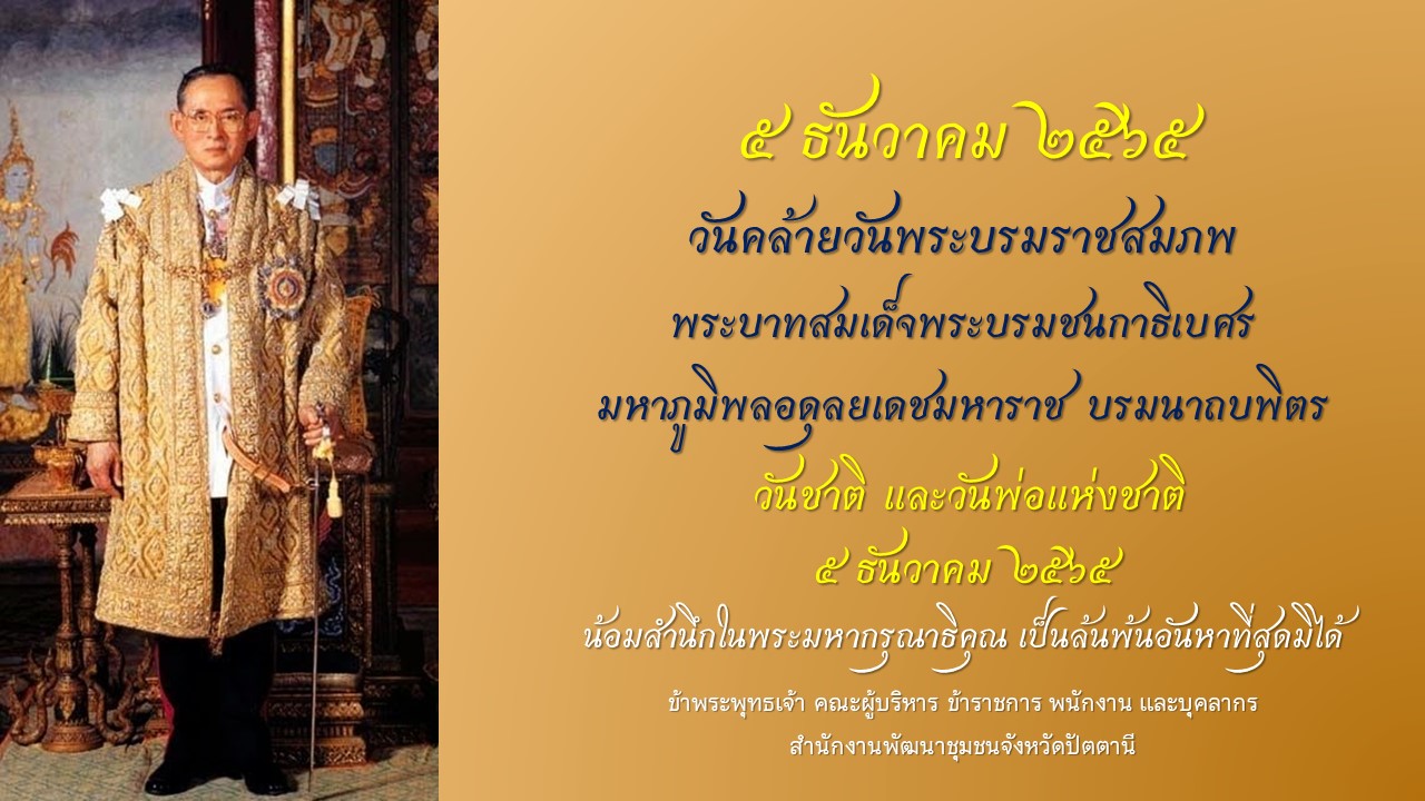 ข้าพระพุทธเจ้า คณะผู้บริหาร ข้าราชการ พนักงานและบุคลากร สำนักงานพัฒนาชุมชนจังหวัดปัตตานี ต่างร้อยรวมดวงใจเป็นหนึ่งเพื่อแสดงความจงรักภักดีและน้อมรำลึก สำนึกในพระมหากรุณาธิคุณอันหาที่สุดมิได้