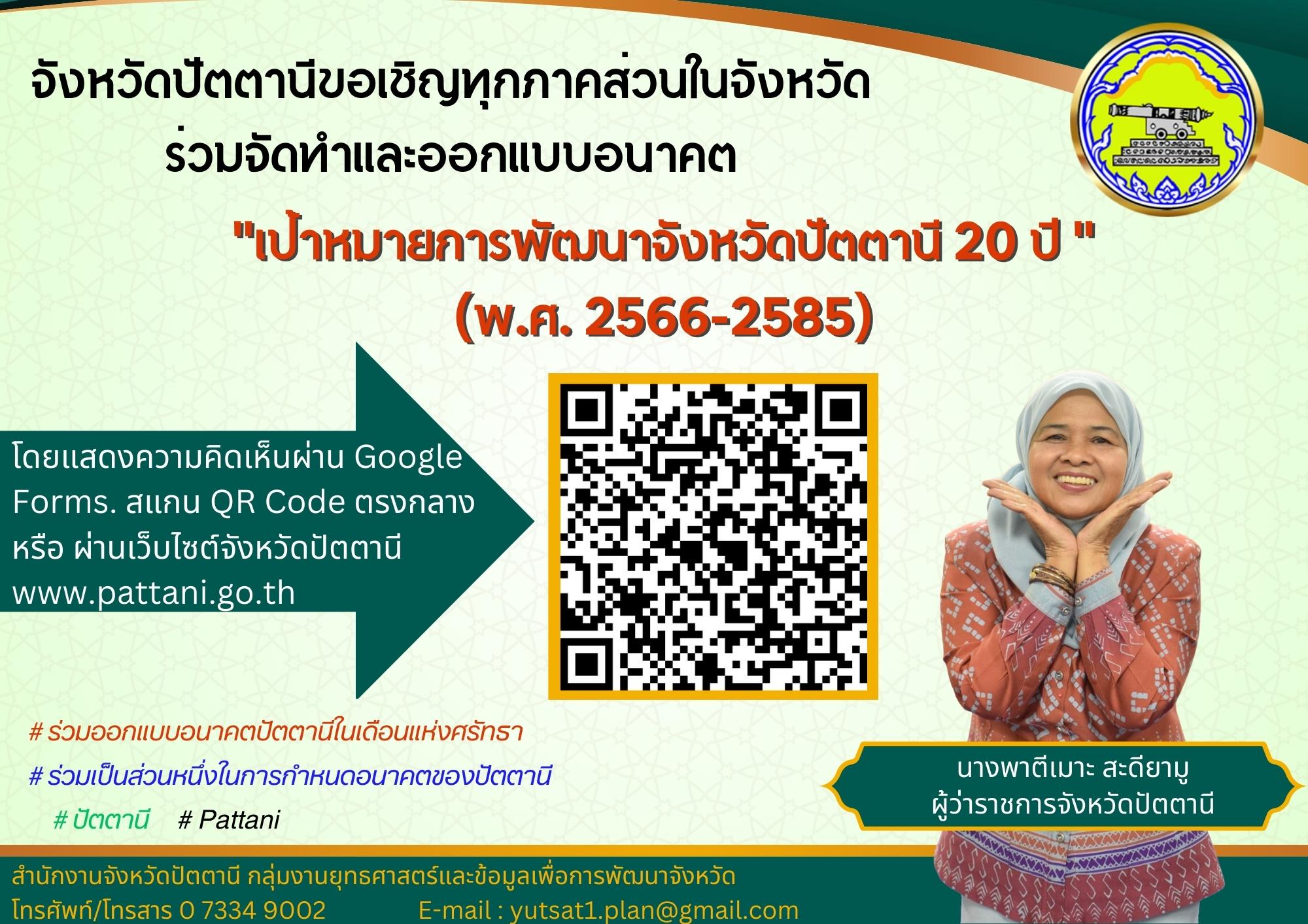 ร่วมเสนอแนวคิด “เป้าหมายการพัฒนาจังหวัดปัตตานี 20 ปี” (พ.ศ.2566-2585) 09 พฤษภาคม 66 / 14:54 น. Facebook iconFacebookTwitter iconTwitterLINE iconLine (Visited 1 times, 1 visits today)Facebook iconFacebookTwitter iconTwitterLINE iconLine